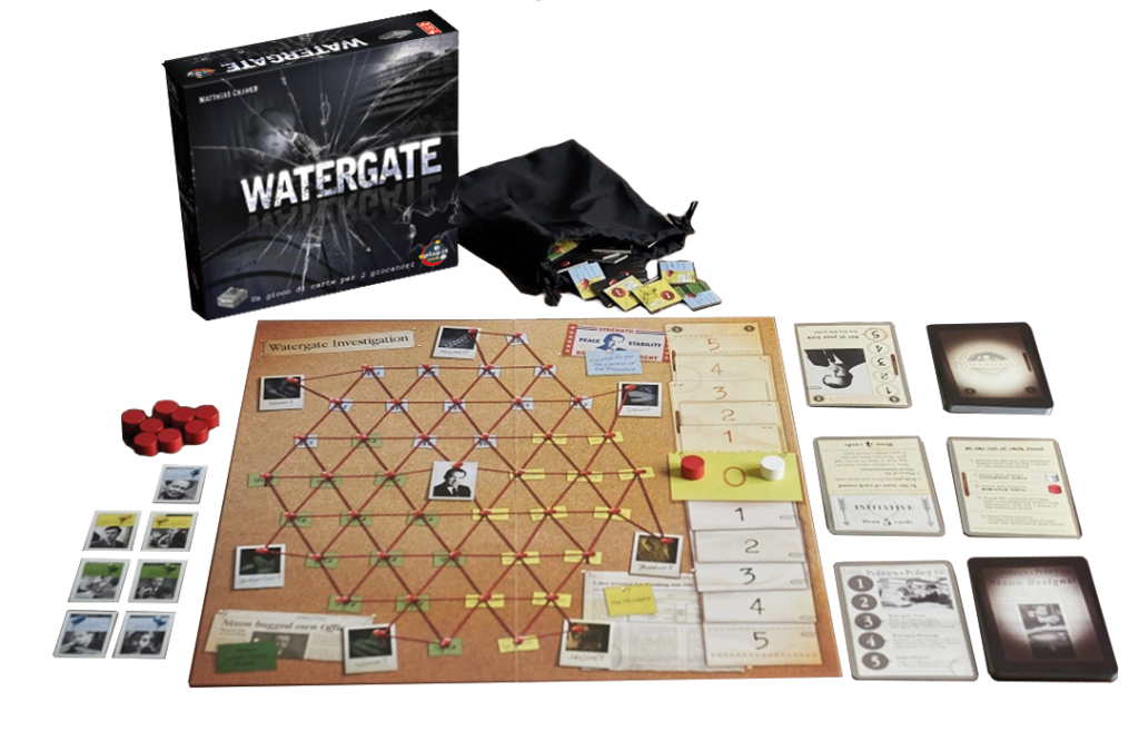 In Watergate, un giocatore interpreta il ruolo di Editore di Giornale, mentre l’altro veste i panni dell’Amministrazione Nixon, ognuno con un proprio set di carte. Per vincere, l’Amministrazione Nixon deve accumulare abbastanza consenso per arrivare a fine mandato, di contro l’Editore deve raccogliere abbastanza prove per collegare due informatori direttamente al Presidente. Logicamente l’Amministrazione Nixon farà di tutto per insabbiare quelle prove. Può la fonte anonima, nota come “Gola Profonda”, ribaltare gli equilibri? Un’elettrizzante corsa contro il tempo sta per iniziare…