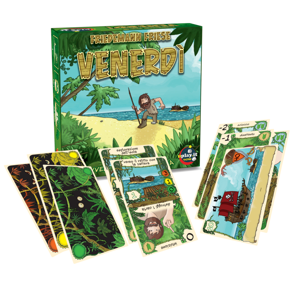 Secondogenito della Friedmann Friese Series: Freitag-Project di Friedmann Friese, Venerdì è un gioco di carte in solitaria in cui impersonerete il fidato amico di Robinson Crusoe, appena naufrago sulla vostra isola. Lo scopo del gioco è superare i pericoli che di volta in volta metteranno a rischio la vita di Robinson, rappresentata da dei segnalini in legno. La sfida finale consiste nell’affrontare due navi pirata col mazzo che costruirete durante il corso della partita.