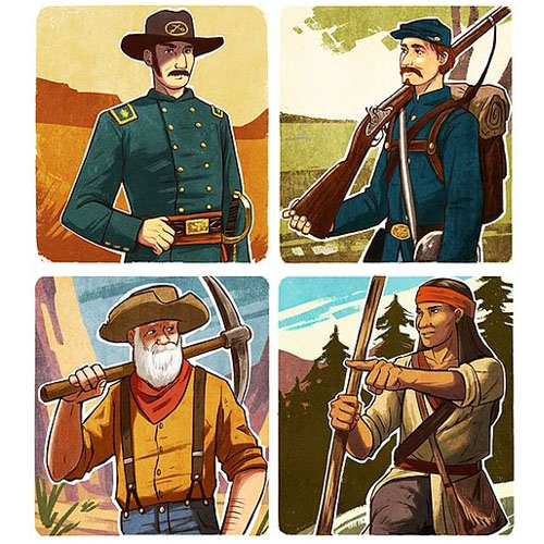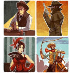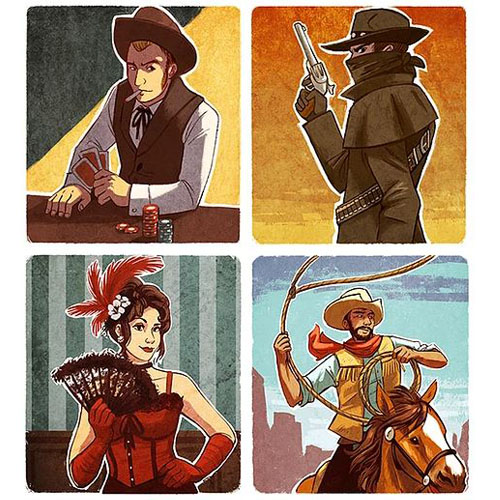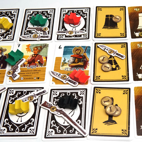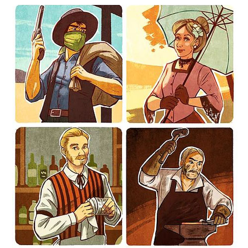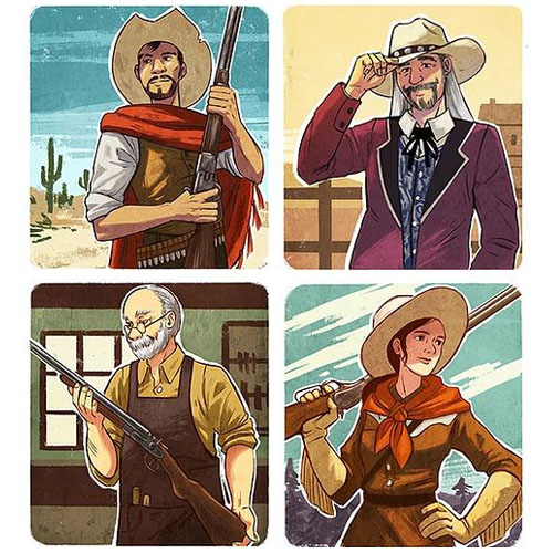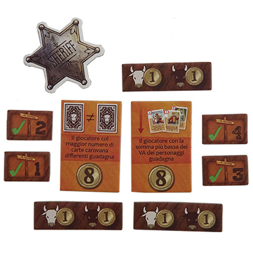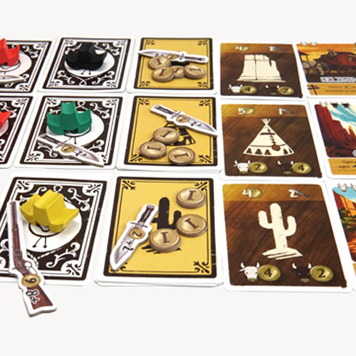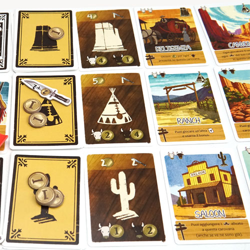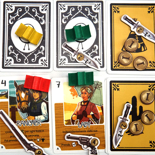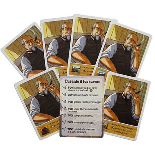 Create your team of sketchy characters, play the caravan cards that will help you bringing the herds to destination, assign your characters to the caravan and give to them weapons so that, when the caravan will reach destination, you will have some good points to get your part of proceeds. Your characters will in fact give you money depending on their ability and on their value that can be increased by their weapons.