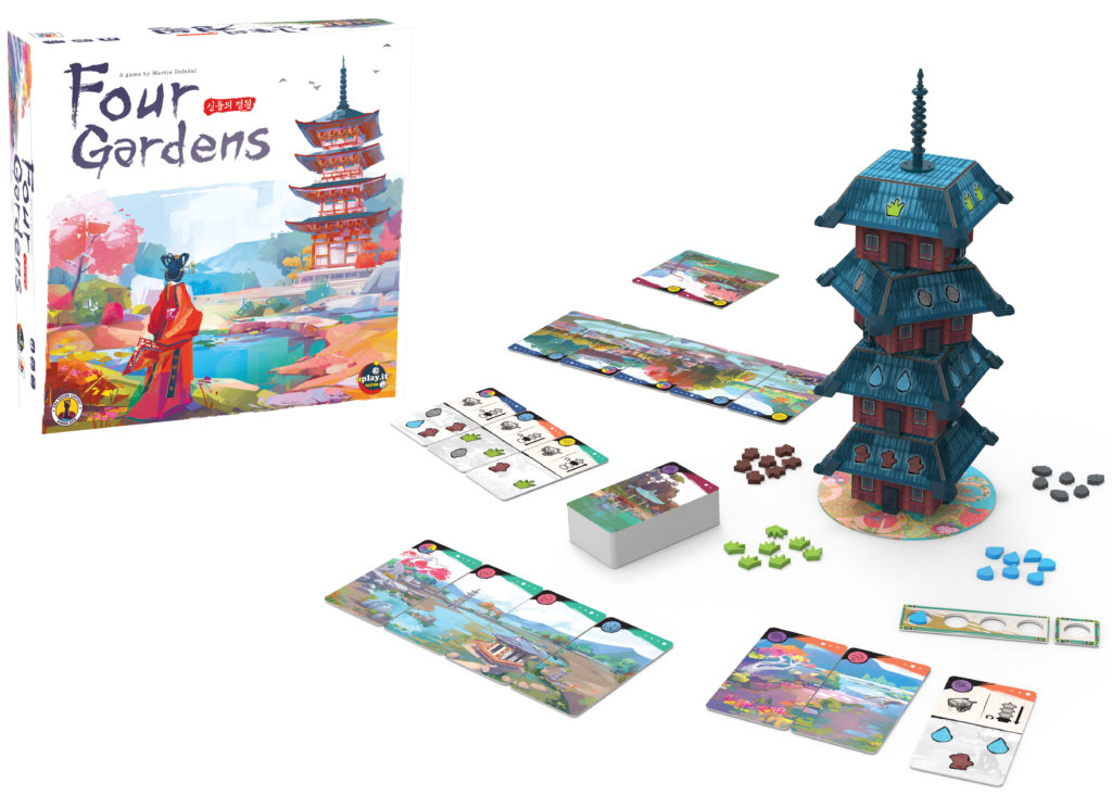 In Four Gardens, l’obiettivo dei giocatori è accumulare quanti più punti possibili completando le Carte Paesaggio e i set. Una volta